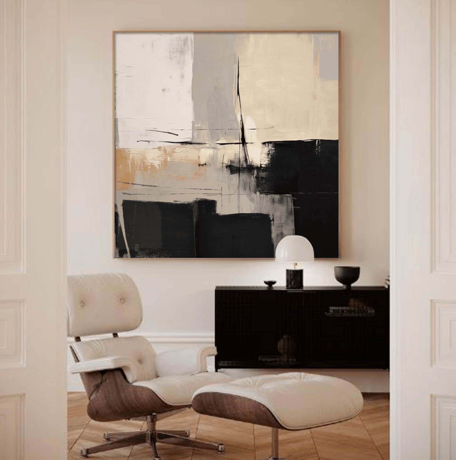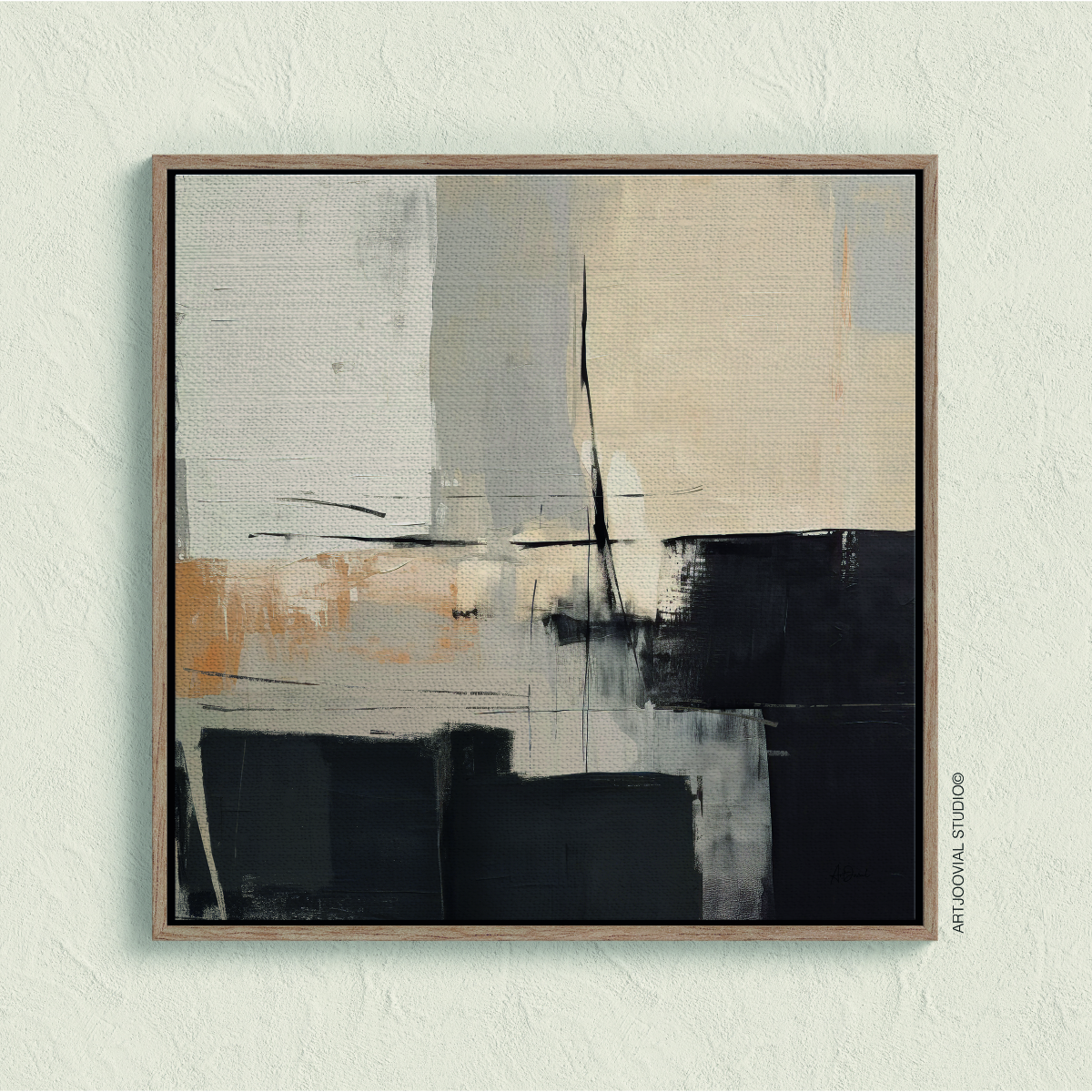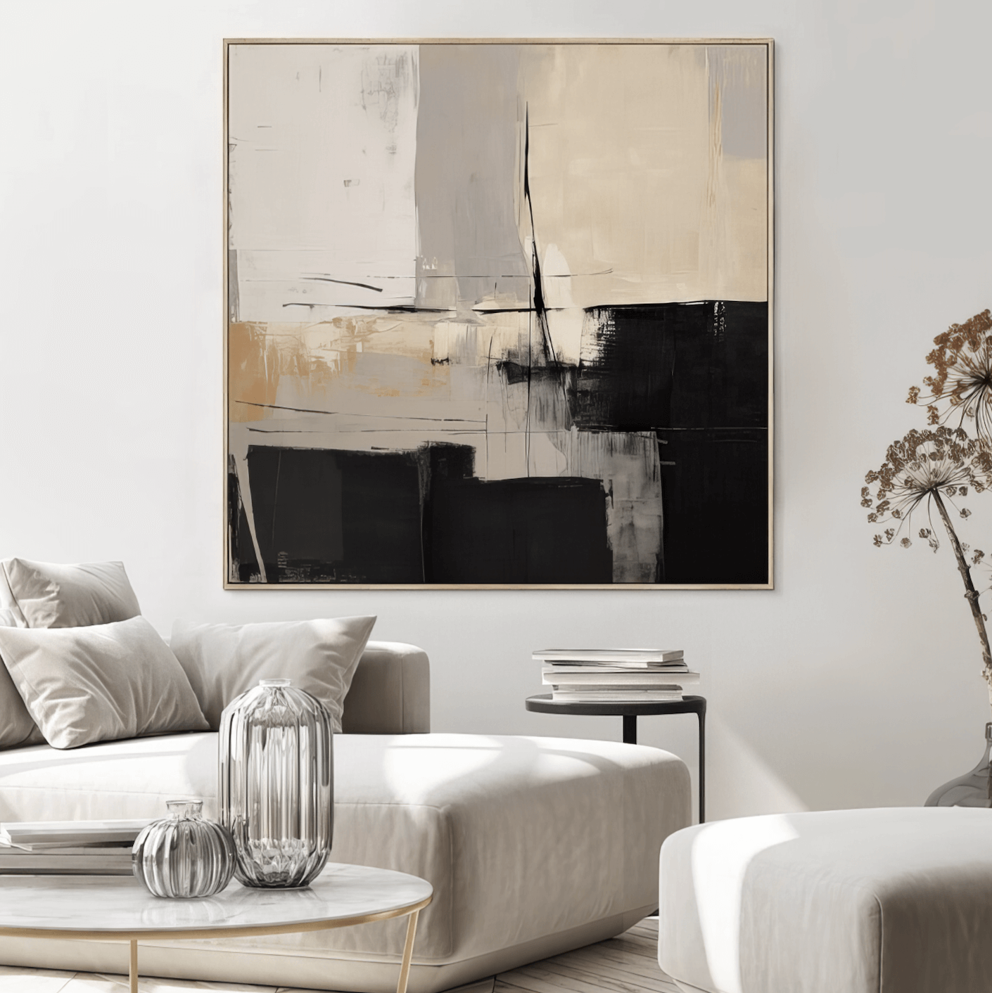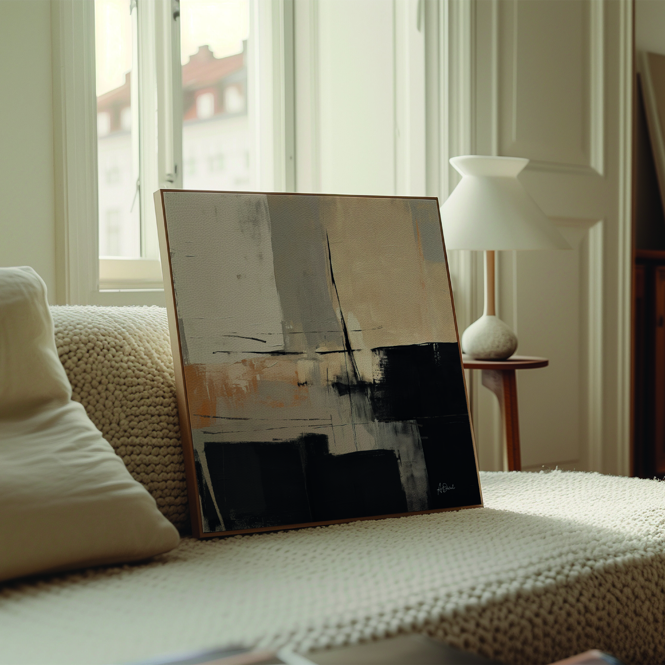 Une composition abstraite jouant sur les contrastes entre noir profond, beige et touches de gris. Lignes et textures se mêlent pour un rendu à la fois structuré et spontané, évoquant l’architecture et le dynamisme urbain