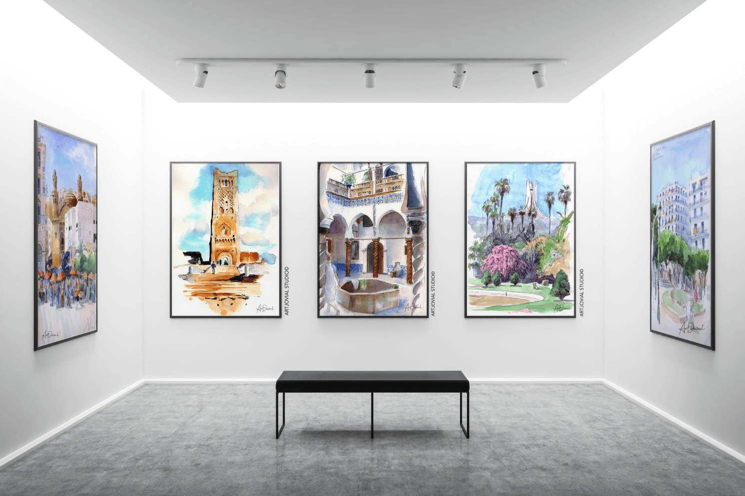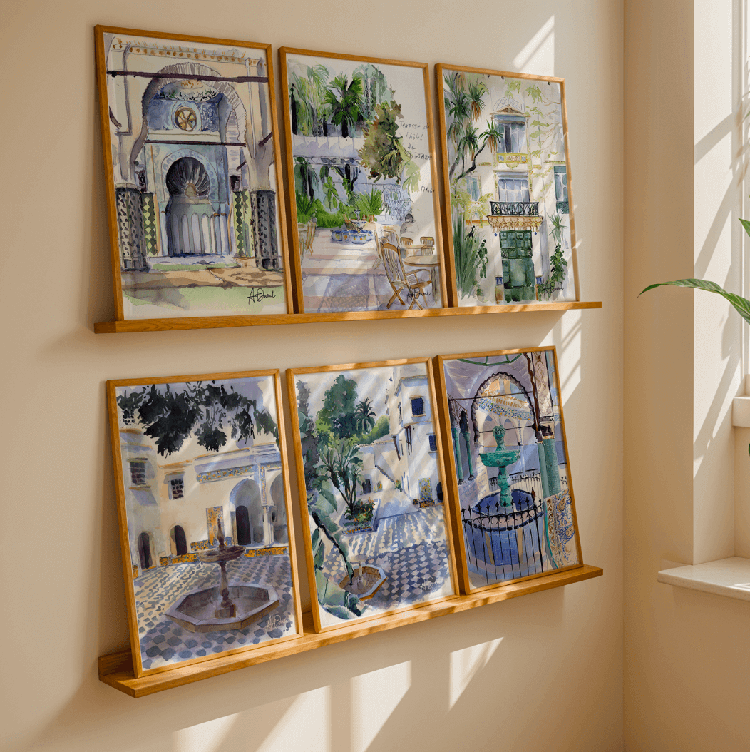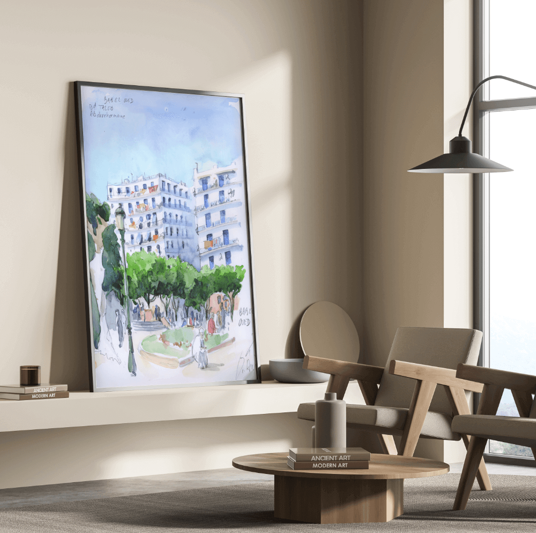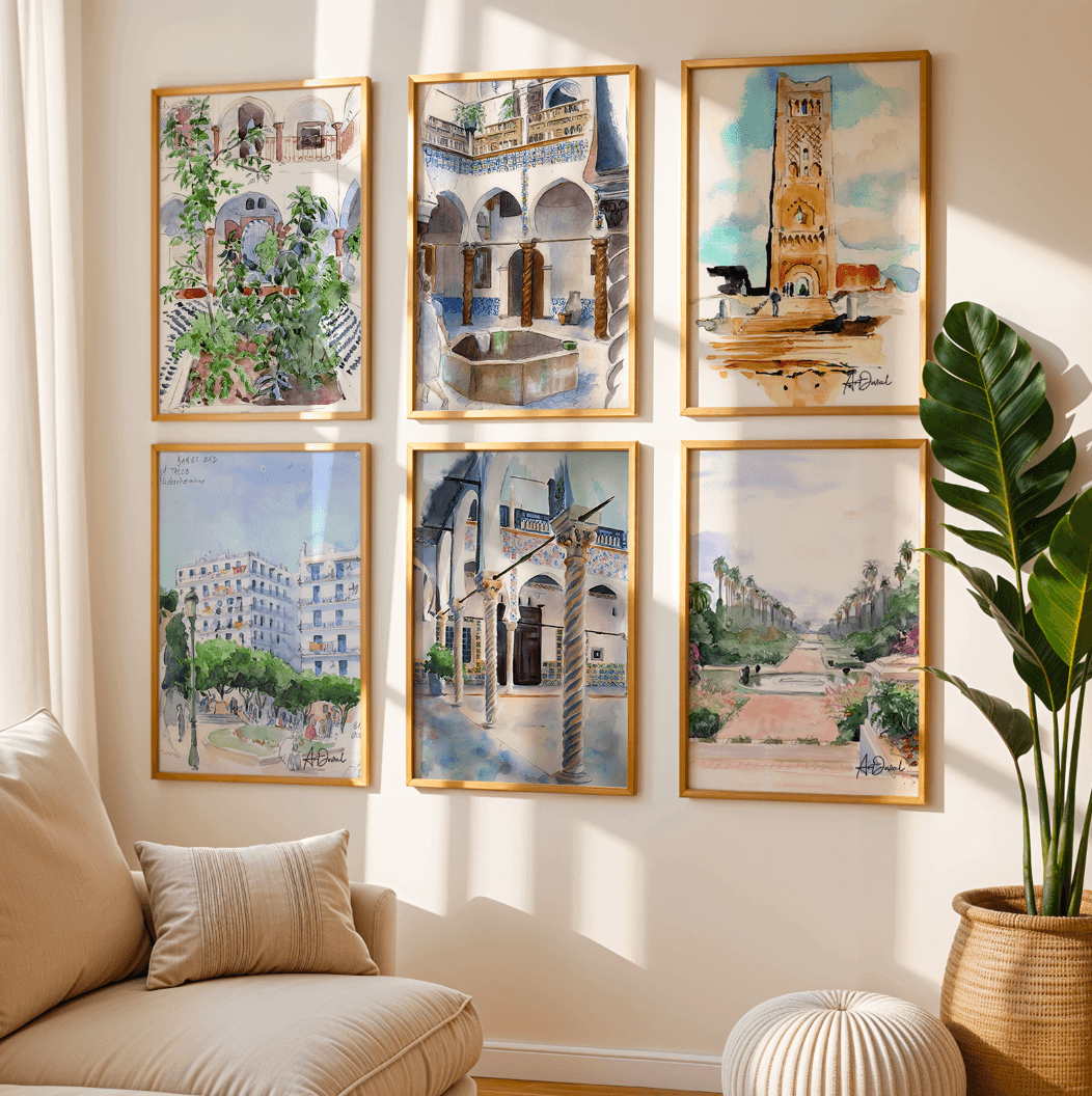 Souvenirs d’Algérie est une série exclusive de reproductions rares illustrant le centre-ville d’Alger. Ces aquarelles capturent avec délicatesse l’architecture et l’atmosphère unique de la capitale algérienne, offrant un aperçu intemporel de ses rues et monuments emblématiques. Chaque œuvre, subtile et vivante, invite à redécouvrir Alger sous un regard artistique et authentique.