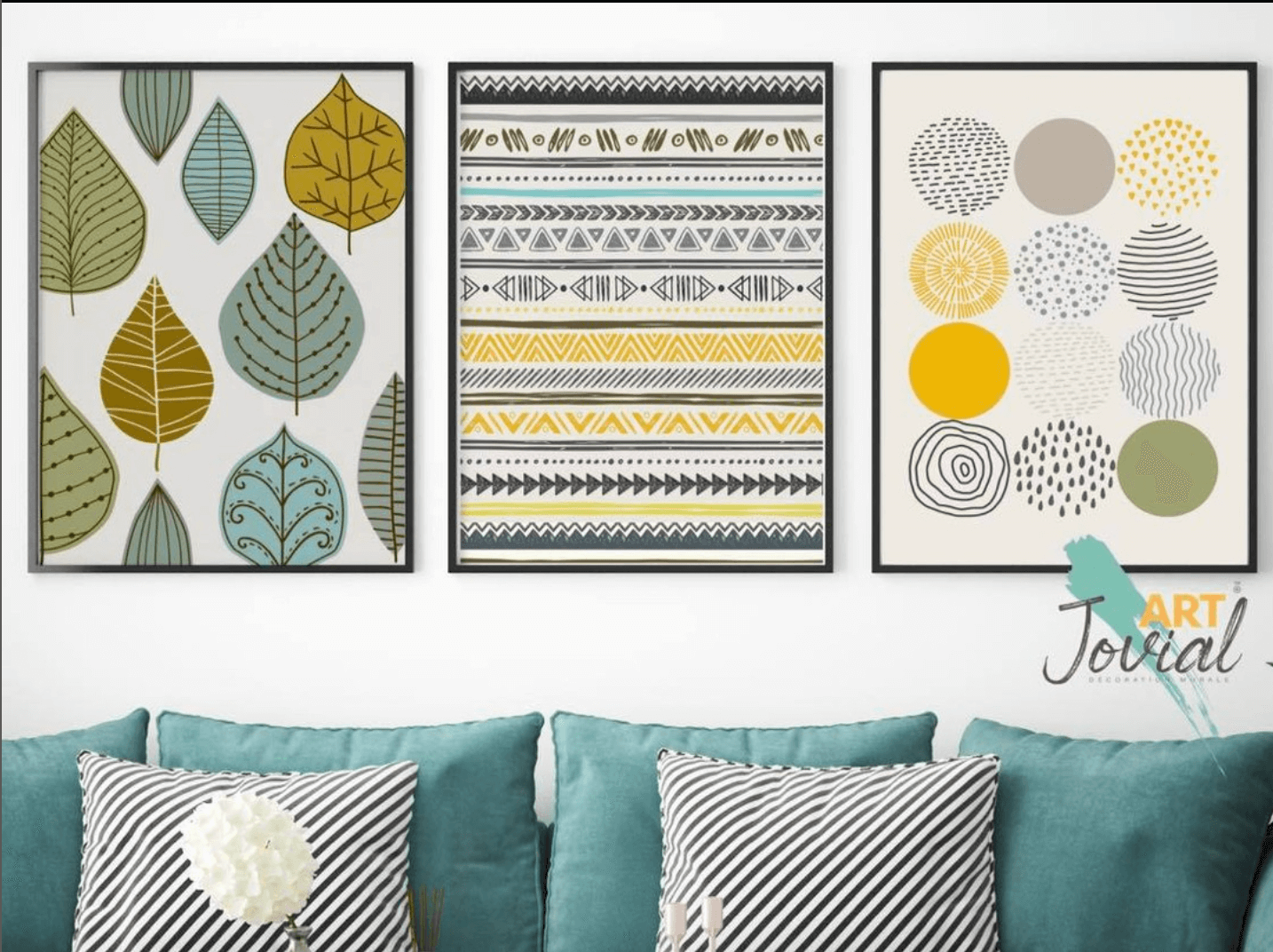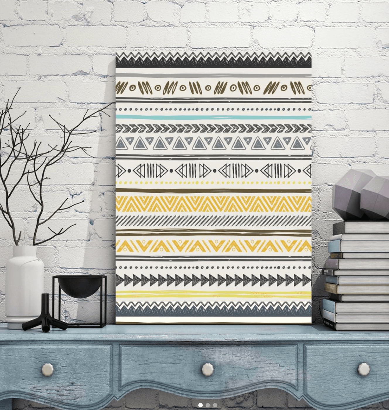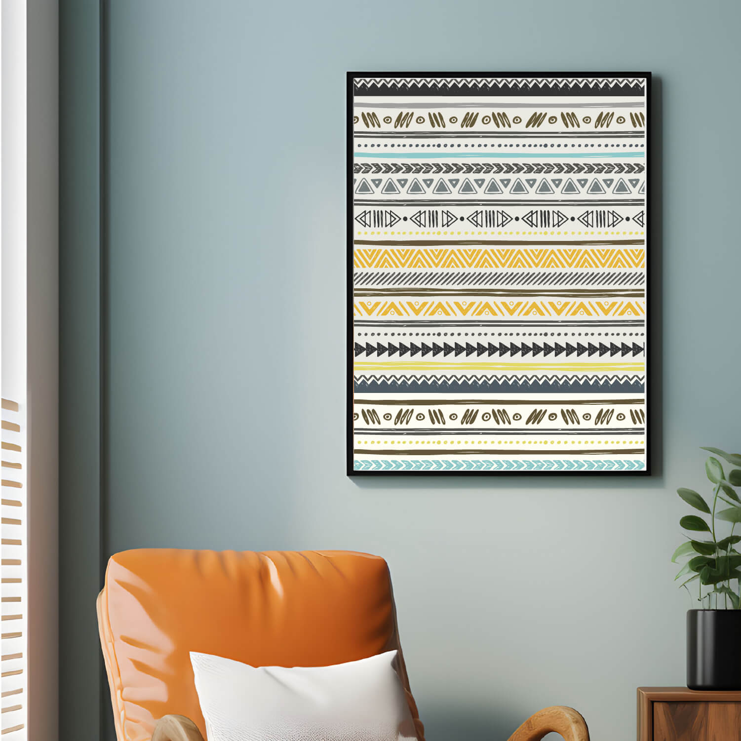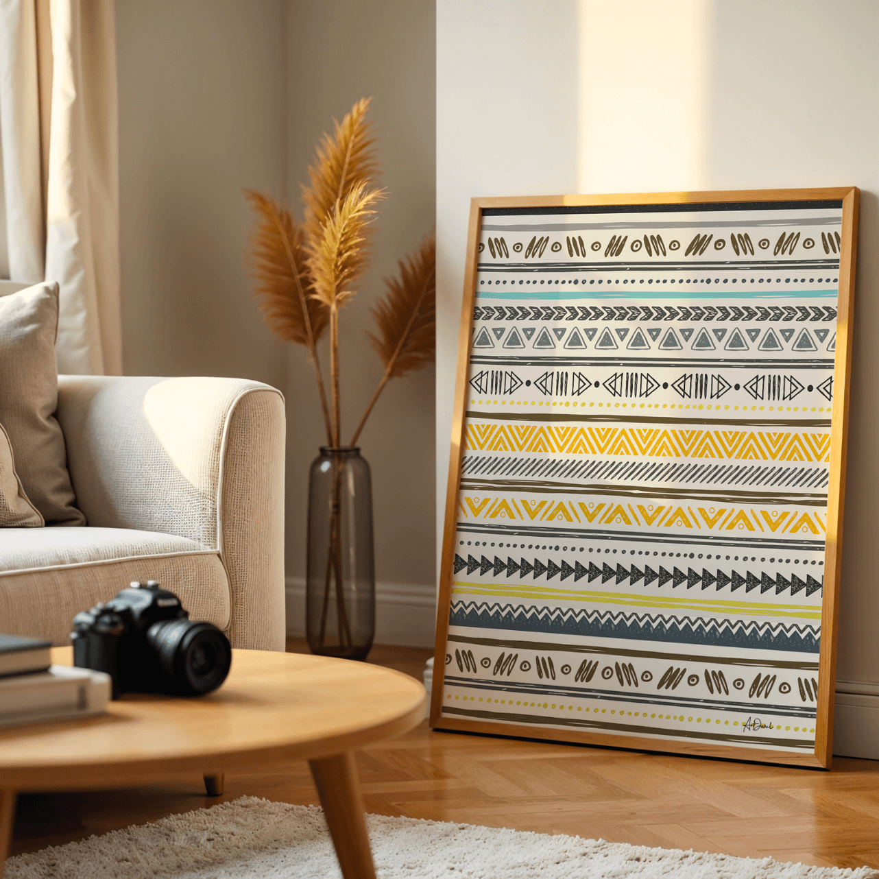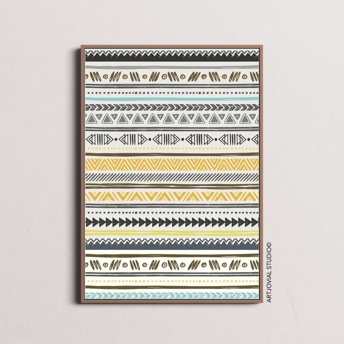 Ce tableau présente un élégant motif ethnique stylisés aux tons verts, jaunes moutarde et bleus, apportant une touche naturelle et apaisante à tout intérieur