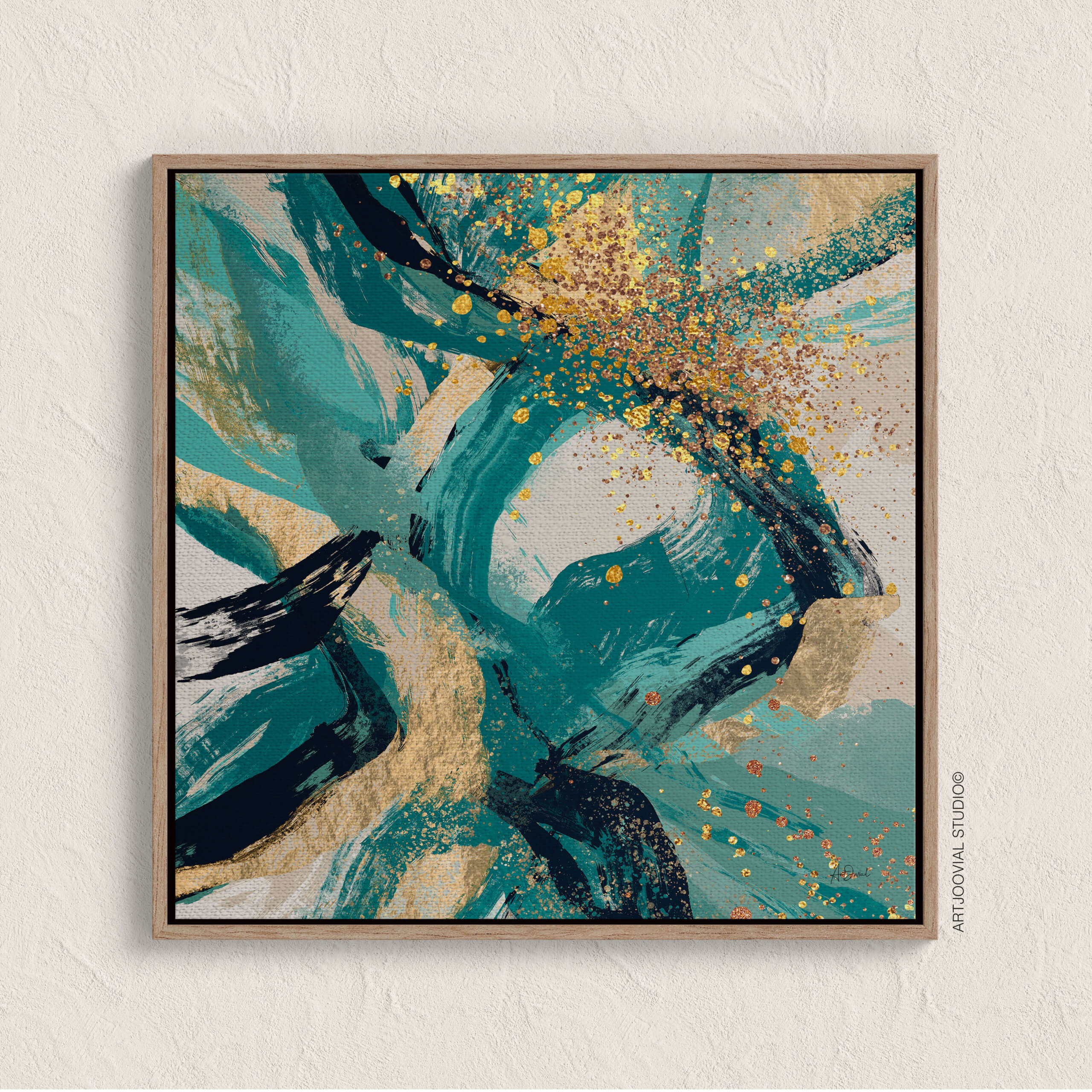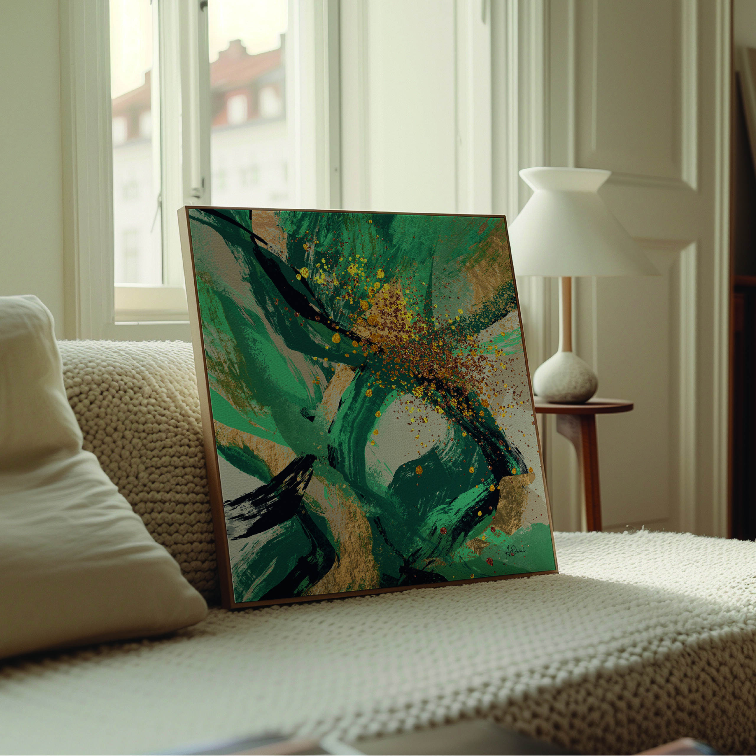 Une explosion d’énergie et de mouvement s’exprime à travers cette œuvre abstraite aux nuances de vert émeraude et de touches dorées scintillantes. Les courbes fluides et les éclats lumineux créent une composition dynamique qui évoque à la fois la force de la nature et l’élan créatif. Un tableau captivant, idéal pour apporter profondeur et élégance à tout intérieur contemporain.